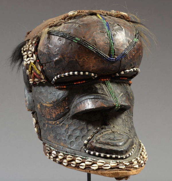 L’un des masques principaux de la typologie des masques royaux chez les Kuba est le masque Bwoom.Généralement très décoré de perles, de cauris, de plumes, de peau de léopard comme la plupart des masques Kuba, celui-ci représenterait le frère du roi devenu fou pour avoir tué son neveu.Il porte souvent un bandeau sur les yeux,... Lire la Suite →