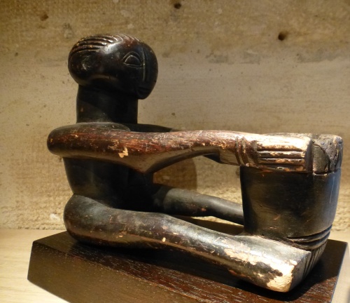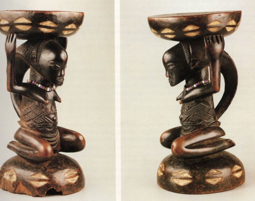 La célèbre sculpture du Musée du Quai Branly attribuée au Maître des coiffures en cascades est l'archétype de ces appui-tête si célèbres chez les Luba.Outre les coiffures sophistiquées des personnages, on pourra remarquer leur position particulière: les jambes repliées, calées contre le genou de l'autre.Peut-être s'agit-il d'un signe de soumission ou d'allégeance? Peut-être est-ce une... Lire la Suite →