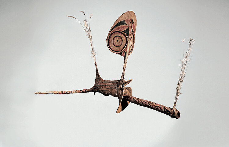 Avec ses yeux si grands, comme étonné dans la nuit où il danse, le masque Vung-Vung fait résonner d’un bruit sourd le long tube qui surgit de sa bouche. Dans les montagnes reculées du Nord de la Nouvelle Bretagne, il saute au-dessus du feu afin de célébrer (peut-être ?) des initiations. L’appendice est fonction : les hommes Baining sont aussi «orchestre».