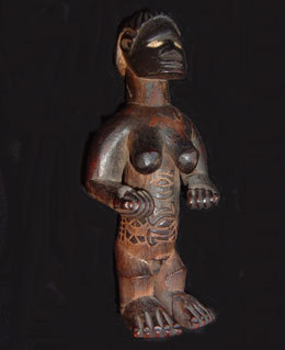 Les statuettes Teke, presque toujours masculines, repésentent des ancêtres ou des esprits protecteurs. Elles renferment, le plus souvent, la charge magique dans leur abdomen. Sans doute destinée à protéger des maladies, la statue présente ici un oeil curieusement vertical et une charge posée sur le front !