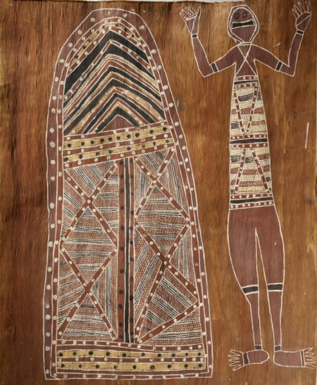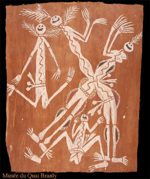 Ce que j'annonçais en parlant de « peinture pédagogique» chez Yirawala, se retrouve sur cette écorce. Irvala peint un motif avec des rarrk, de fines lignes multicolores, hachées; des croisillons. Les rarrk sont propres à chaque groupe. Yirawala,lui, appartient au groupe Gunwinggu (ou Kunwinjku) et à la moitié Dua (ou Dhuwa). Au centre et à l'est... Lire la Suite →