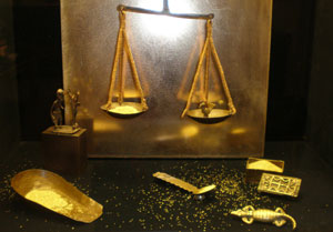 Des cauris, des manilles de cuivre, des pains de sel jusqu’aux fameux poids Akan servant à la pesée de la poudre d’or, une petite exposition dévoile ces différentes monnaies africaines.