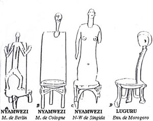 Chez les Nyamwezi, la courbure des pieds semble inverse. Chez les Luguru, la tête qui orne le haut du dossier présente une crête sagittale, mais cela ne constitue pas encore un caractère précis d’attribution puisqu’on la retrouve chez les Kaguru, peuple voisin.