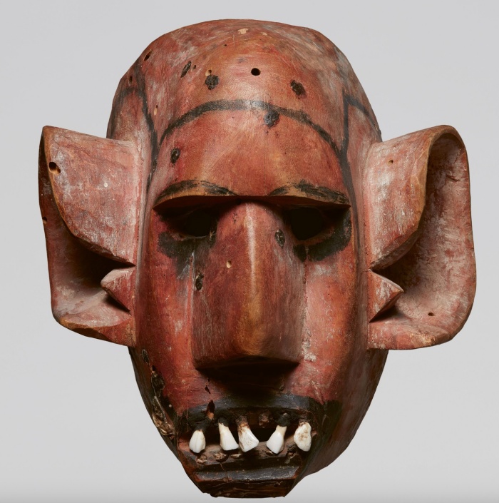 Plus au Nord de la Tanzanie, ce second masque, d’origine Sukuma, est lui aussi très expressif. Doté d’oreilles rapportées (il en manque une), on distingue également l’adjonction de cheveux. Ce type de masque intervenait lors de compétitions dansées.