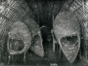 Photo 3 : Monstres de vannerie kaiaimunu au fond de la maison de hommes, Golfe de Papouasie, photographie de Frank Hurley, 1922, in Qu’est-ce qu’un corps ?, 2006, dir. Stéphane Breton, Ed. Flammarion, Musée du Quai Branly.