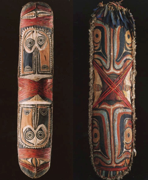 Chez les Mengen de Nouvelle-Bretagne, ce sont des sortes de curieux visages qui semblent nous regarder, là encore en miroir… mais s’agit-il de visages ?