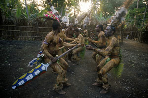 Un homme, entouré de danseurs masqués, semblables aux rares masques Rom Kon de l’île d’Ambrym aux corps couverts d’un costume de rubans de feuilles de bananier, semble surgir d’un autre monde, d’un autre âge.