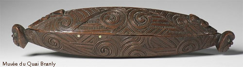 Poursuivant l’étude de quelques oeuvres de l’art Maori, nous sommes frappés par la richesse des décorations de certaines boîtes à couvercles dont les surfaces sont entièrement gravées d’un enchevêtrement de motifs spiralés.