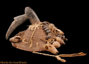 Cet objet énigmatique, de près de 50 cm de long, est composé d'une petite tête sculptée dont la coiffure concave se prolonge afin de former armature. Le corps n'existe pas, mais est remplacé par un ensemble de plumes de frégates taillées en dents de scie.Appelé jadis « charme de guerre », cet objet est un... Lire la Suite →