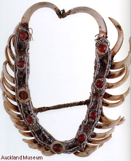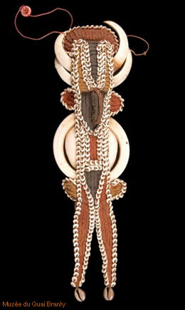 Encore, une étrange parure que ce collier composé de dents de cochon, de perles, de graines d'abrus, autrefois porté dans la province d'Oro, dans le sud-est de la Nouvelle-Guinée. De fait, le gibigibi était aussi un ornement facial (comme l'erumo pouvait être ornement de bouche).Par le port de cette parure-amulette, le guerrier signifiait qu’il disposait... Lire la Suite →