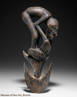 Une brève étude sur les Maisons des hommes dans les régions du Sépik, m'a permis de côtoyer (malheureusement de manière tout à fait intellectuelle grâce aux ouvrages et à leurs illustrations) des objets surprenants.Ainsi en est-il de ce crochet de suspension chez les Biwat.Les crochets auxquels les hommes suspendaient leur filet étaient bien souvent décorés,... Lire la Suite →
