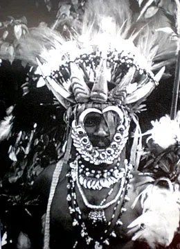 Impressionnant par la richesse de sa coiffure en plumes, ses colliers en perles et dents de chiens, ses brassards de plumes multicolores ; le guerrier, paré du gibigibi, arborait tout ce qui pouvait lui conférer une stature sur-humaine ; ayant accaparé la puissance mais aussi la valeur des animaux.