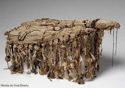 Un étrange animal cohabite sur le plateau des collections du musée du Quai Branly auprès des flûtes sacrées du Bas Sepik.Constitué de vannerie, de coquillages, de fibres, de graines et d'os ; celui-ci prend la forme du crocodile. Déjà signe ostentatoire de richesse par la présence des cauris et des nassa, la forme devient surréaliste... Lire la Suite →