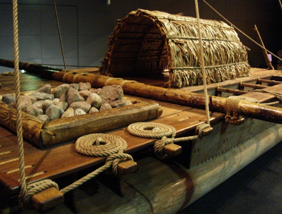 La mise en exposition de bateaux grandeur nature dans la section Océanie du musée d'ethnographie de Berlin mobilise un vaste espace du rez-de-chaussée.S'y mêlent waka polynésiens et embarcations de Mélanésie insulaire et de Micronésie.Seul, l'exemplaire ci-dessus est, semble-t-il, une réplique d'un bateau de Tonga. L'existence de réelles places à vivre sur les coques ou flotteurs... Lire la Suite →