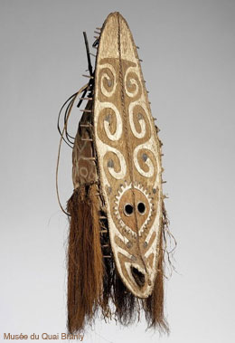 L’on trouve encore les masques keveke (comme ci-dessous) et plus au fond de la maison cérémonielle, les rhombes, de grands fuseaux plats décorés. Il s’agissait des « grands frères » des masques et des représentations d’ancêtres.