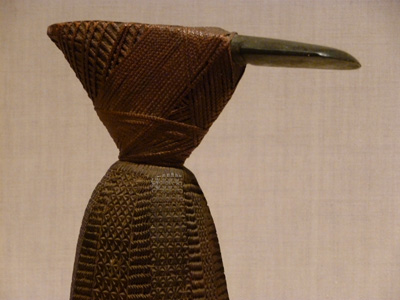 Plus curieux encore l’herminette cérémonielle de Mangaia, une autre île des îles Cook. Celle-ci condense l’art du bois, de la pierre et surtout de la ligature. La finesse de ce travail, la présence de motifs en forme de K ont longtemps questionné et questionnent encore les ethnologues sur leur fonction.