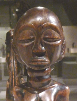 De plus, les yeux ainsi baissés, le visage dégage une attitude sereine que l’on peut rapprocher de celle de nombreuses sculptures Luba. Or chez les Luba, il n’existe par de représentation de figures masculines les yeux mi-clos.