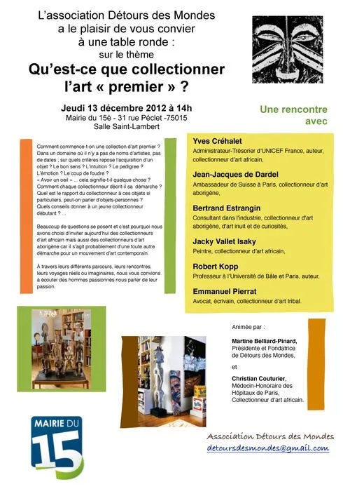 L’association Détours des Mondes organise une table-ronde le jeudi 13 décembre de 14h à 16h sur le thème de Collectionner l’art premier.