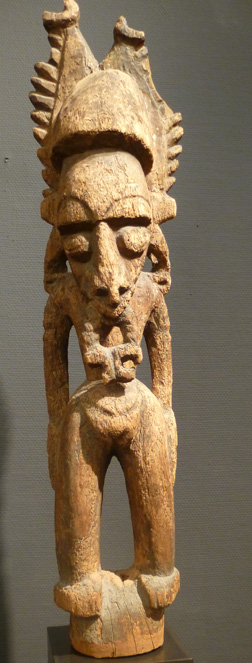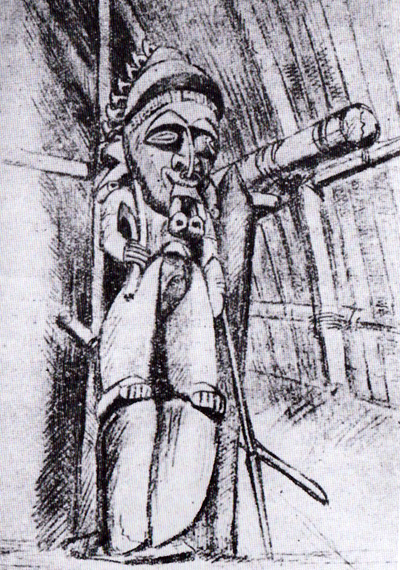 La sculpture du musée de Leyde est aussi passionnante d’une part pour son histoire puisque Nikolai Mikloucho-Maclay l’a observée in-situ dans une maison du village de Bongu en 1877, l’a décrite et dessinée (ci-dessous). Le Dr. Otto Finsch (qui fut probablement le premier Européen à remonter le Sepik), a remarqué cette statue lors de son expédition en Papouasie de 1884-85 et était certain que celle-ci existait depuis des générations.