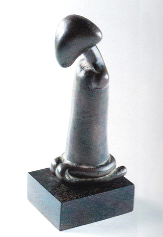 Forme éternelle que celle de ces « idoles » féminines où l’absence de traits renforce l’universalité de la sensualité. Seule la courbure du buste répond à celle des jambes repliées et la convexité du corps à celle du visage anonyme projeté vers l’avant.