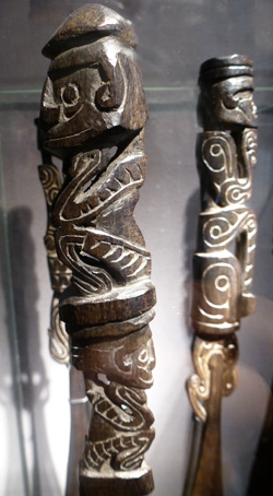 Les sculpteurs ont rivalisé d’ingéniosité sur ces petits ouvrages, parfois utilisés dans un contexte de magie, pour favoriser la pêche ou protéger les embarcations du gros temps en mer. Un incroyable bestiaire où se mêlent figures anthropomorphes, se déploie au sein d’une flopée de volutes. Par exemple sur la spatule de droite, le personnage féminin repose en fait sur la gueule d’un crocodile ; plus haut, on remarquera deux oiseaux qui se font face et en dessous d’eux, l’on pourrait voir encore deux poissons affrontés.