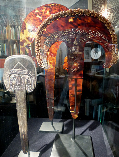 Très raffinées encore, les spatules en écaille de tortue laissent apercevoir au sein de leur croissant des têtes d’oiseau. Dans le Sud de l’archipel de la Louisiade, de telles spatules étaient utilisées comme monnaie.
