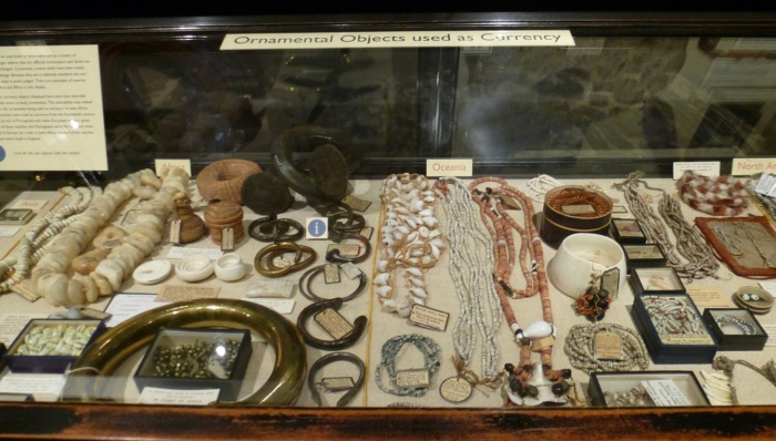 Photo de l’auteure : Vitrine de monnaies traditionnelles, Pitt Rivers Museum, 2012.