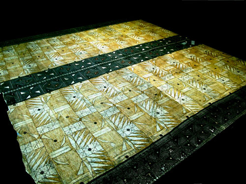 « … La quasi-totalité de ces pièces, exceptionnelles et fragiles, n’a jamais été présentée au public en Europe. Elles sont issues pour certaines des collections ethnologiques du Rautenstrauch-Joest-Museum de Cologne mais surtout d’importantes institutions de la sphère pacifique comme le Musée Te Papa Tongarewa de Wellington (Nouvelle-Zélande) ou l’Australian Museum de Sydney. Elles illustrent le Tapa issu de Papouasie-Nouvelle-Guinée, des îles Salomon, du Vanuatu, de Samoa, du Tonga, de Futuna, de Niue ou des îles Fiji.
