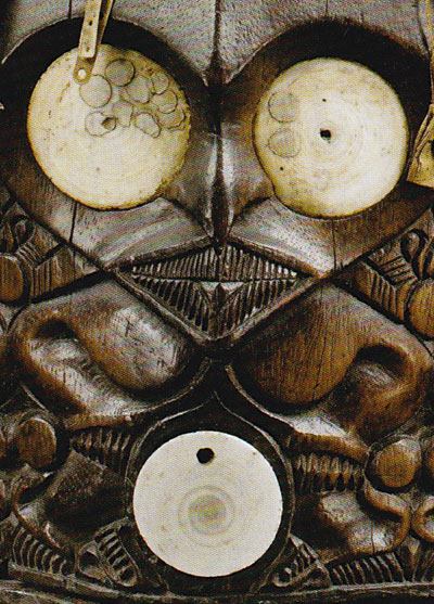 Détaillant ces différents exemples, il me semble que ce qui frappe de prime abord est la présence de ces visages en forme de coeur réalisés en haut relief, aux grands yeux figurés par des disques de coquillage et pourvus d’une petite bouche qui laisse entrevoir des dents acérés.