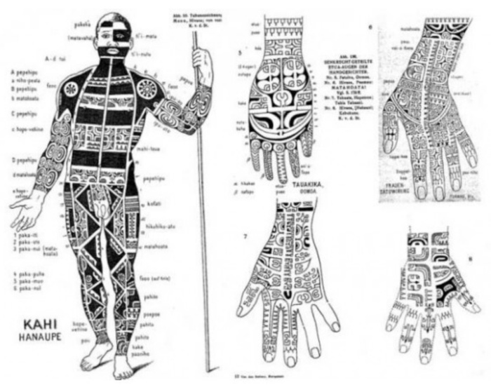 « C’est au Henua ‘Enana, l’archipel des Îles Marquises, que l’art du tatouage avait atteint, dans le Pacifique, son apogée en terme de surface corporelle. Ces figures représentaient en grande partie des symboles religieux, les images d’objets, de la faune ou encore de la flore qui les entouraient. Nous verrons dans un premier temps la vision ancienne de l’univers polynésien, dont les ‘Enana (Marquisiens) font partie, et comment ces derniers le représentaient dans le tatouage. Puis nous analyserons la transformation individuelle, par association de motifs, que subissent certains symboles et qui ont donné lieu à la particularité du tatouage marquisien. Et enfin, nous verrons l’influence mutuelle et permanente entre les arts plastiques culturels marquisiens que nous pouvons, pour certains de ces objets, observer dans les musées (sculptures, pétroglyphes, parures, outils etc.) et le tatouage. » (source MQB)