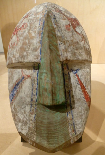 Ces masques impressionnants par leur forme brute et leur éclatant polychromie n’ont pas les yeux percés : ils ne devaient pas être portés, mais accrochés sur des sortes de portiques. Certains, plus petits devaient peut être danser dans les mains ?