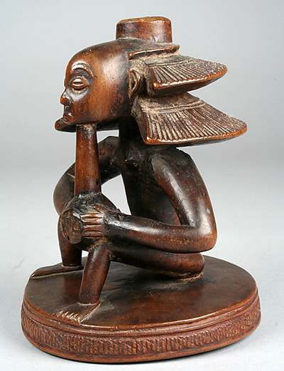 Indubitablement, l’oeuvre conservée au Musée Royal de l’Afrique Centrale à Tervuren (ci-dessous) entre dans ce corpus. Toutes ces figures ont la même position : accroupie avec les jambes écartées repliées vers l’arrière, la représentation féminine possède de longs bras repliés, les mains posées sur le ventre.