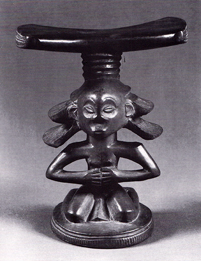 Ezio Bassani écrit justement dans une note publiée sur le site de Christie’s : « …L’appui-tête de la collection Blum fait partie d’un petit corpus d’oeuvres que William Fagg et Margaret Plass, en étudiant l’une d’entre elles en 1964, nommèrent « Maître de la coiffure en cascade », en raison des coiffures monumentales – deux énormes ailes extrêmement élégantes – ornant ces personnages…