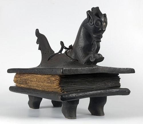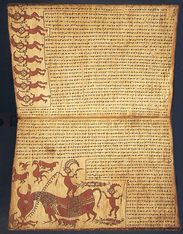 Le plus grand livre de magie Batak connu et probablement le plus ancien, est l’exemplaire du Tropenmuseum (ci-dessus) qui fut justement collecté par Van der Tuuk. La couverture est surmontée d’un animal dont la tête est celle d’un singa, ce mélange de dragon, de serpent ou encore d’éléphant que l’on croit deviner dans ses formes.