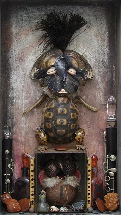 Il semble alors pertinent de provoquer des tête-à-tête entre les arts lointains et les productions d’art brut, d’art Outsider ; mais aussi comme ici avec des oeuvres à la frontière des arts singuliers.