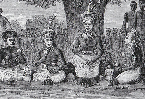 « Derrière lui (le devin) marchait une femme qui portait dans une calebasse l’idole dont il était le prêtre » (Cinq autres mediums arrivèrent ensuite ; quand ils furent tous arrivés, ils se placèrent en ligne) « étendirent leurs nattes devant eux, et y déposèrent leurs idoles et autres instruments d’imposture » (La séance de divination commença alors). « Quand (ils) prétendaient ne pas pouvoir répondre, les idoles étaient consultées ; l’un des féticheurs, ventriloque habile, donnait la solution attendue ; et les pauvres dupes croyaient la tenir de la bouche même des dieux. »