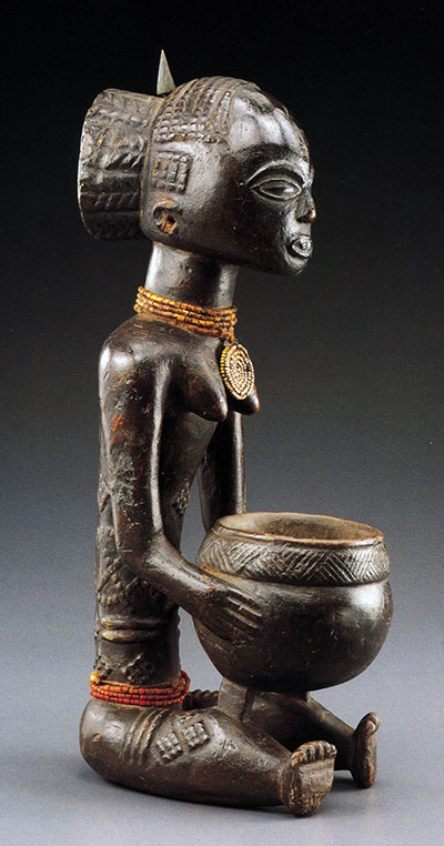 Cette disproportion dans les dimensions n’en font pas une oeuvre à part, pour preuve cette belle porteuse de coupe Luba (ci-dessous), mais il s’agit là d’une production d’un peuple assez méconnu des amateurs d’art africain de par le très faible nombre d’oeuvres qu’on a su leur attribuer.