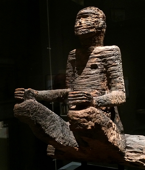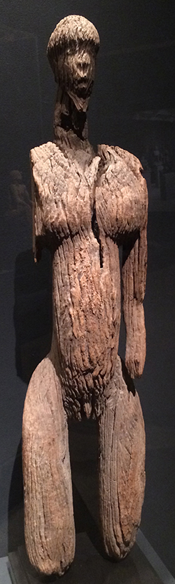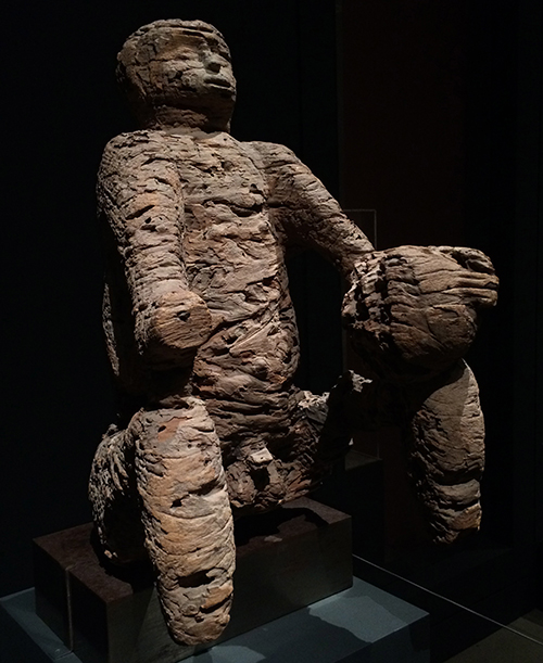Familière aux Parisiens, cette figure assise provient du Pavillon des Sessions du musée du Louvre. Ce fragment de tambour monumental datant du XVIIIe siècle fut acquis en 1974 par Pierre Mauzé pour l’abcien musée des arts africains et océaniens auprès d’Hélène Kamer.