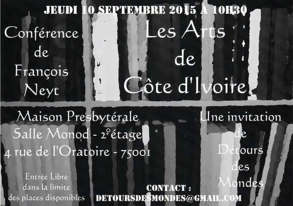 Ayant pour thème les arts de la Côte d’Ivoire — riche d’innombrables ethnies, des Sénoufo aux Baoulé en passant par les Gouro — la conférence sera suivie d’une séance de dédicaces, François Neyt présentant son dernier livre Trésors de Côte d’Ivoire.