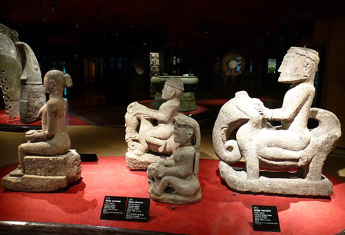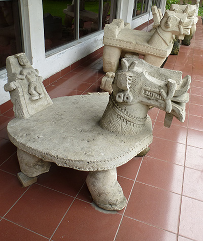Un peu plus loin sur le plateau des collections, c’est un autre animal qui surprend, représenté dans la pierre. Dans l’espace réservé aux oeuvres de l’île de Nias, nous découvrons effectivement deux statues anthropomorphes assez différentes et quelque peu étranges mais aussi deux sièges de pierre monumentaux possèdant des têtes d’un animal que l’on ne sait identifier de prime abord.