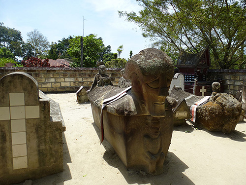 Nous le retrouvons naturellement dans la sculpture de pierre, comme ici à l’avant du sarcophage de Ompu Raja Sojoloan Sidabutar à Tomok dont la tête surmonte un petit personnage (le premier occupant de cet ossuaire ?). À l’arrière, une représentation féminine tient un bol entre ces mains ; un autre est posé sur sa tête.
