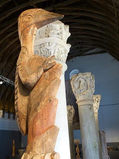 Au-delà du sacré, on est frappé par l’impressionnante charpente en bois de chêne brun du lieu et les bois répondent ainsi à d’autres bois… Le travail de la sculpture du bois répond aussi au travail de la sculpture de pierre des chapiteaux.