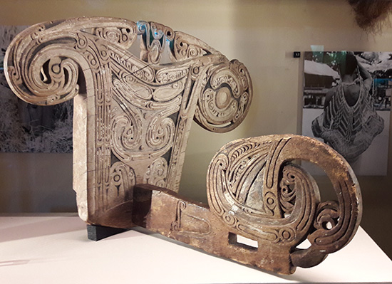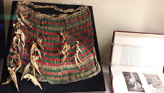S’il n’y a pas d’objets des îles Salomon exposés dans la vitrine, il y a des objets du Vanuatu (ce qui a trait aux cochons et une natte d’Ambae), de Milne Bay (pour la mention aux échanges Kula) et de la province de Morobe. C’est dans cette dernière région que l’anthropologue Françoise Girard avait mené une mission dans les années 1954-55 pour le compte du musée de l’Homme et avait ramené bon nombre de clichés mais aussi quelques objets notamment des Buang. Parmi eux le bâton à déterrer les ignames et le sac en ficelle orné de mâchoires d’opossums qu’on peut remarquer dans la vitrine : des objets du quotidien réellement intriqués dans les relations sociales.