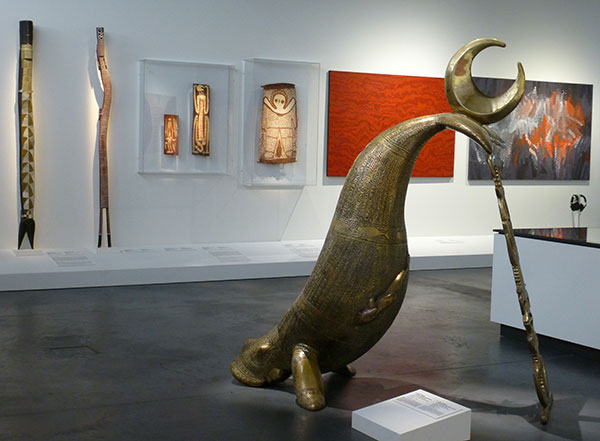 L’exposition est dense. Dans les quatre parties qui la composent, on trouvera encore des installations sur les thèmes visible/invisible ; absence/présence comme ces deux arbres gravés qui ont été coupés (symboles de l’éradication des peuples autochtones) ; mais aussi l’historique des acquisitions des objets australiens qui se trouvent dans les collections du MEG, témoins de l’évolution du regard des Occidentaux puisqu’elles nous conduisent aux peintures acryliques mais aussi à une grande diversité d’oeuvres aux multiples supports et techniques : bronze tel le monumental Dugong d’Alick Tipoti qui trône dans la 3ème partie, filets de pêches du Centre d’Art d’Erub (déjà évoqués) et bien sûr les écorces et la toile…