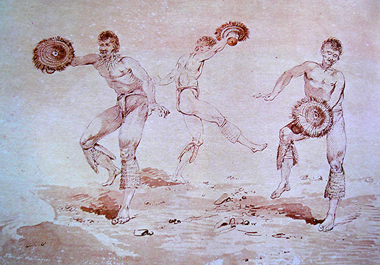 C’est encore un dessin de John Webber qui nous permet d’en connaître la fonction : ce danseur vu sous trois angles différents semble jongler avec un drôle d’objet. Une seule de ces castagnettes nous est parvenue entière, probablement donnée par Joseph Banks au British Museum car la date d’entrée dans les collections mentionnée est 1780.