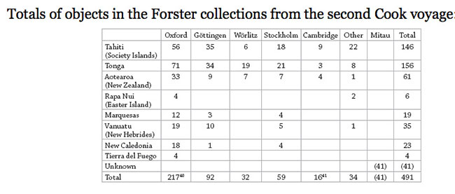 On doit à Adrienne L. Kaeppler un travail conséquent sur la collection Forster. Le recensement qu’elle établit par région et par objet nous permet de jauger l’importance de la collection d’Oxford : Celle-ci est issue d’un don des Forster à l’Ashmoleum Museum en février 1776 juste après que Johan Reinhold ait reçu le titre honoraire de Docteur en Droit Civil en novembre 1775.