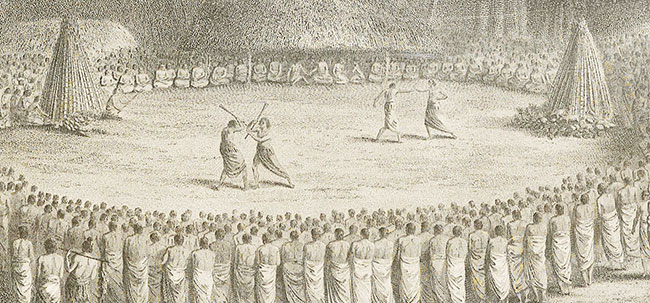 Mais revenons à la fonction de ces massues appelées Akau. Elles étaient utilisées dans des contextes bien différents : la guerre, le divertissement sportif, la danse, la religion ou encore dans la vie de tous les jours comme attributs des personnages de haut rang. Ainsi, une massue qui avait tué beaucoup d’hommes était imprégnée du mana de son propriétaire pour avoir été en lien étroit avec lui, avec sa force, son courage. On garde aussi un témoignage de l’emploi de ces armes dans un contexte de divertissement grâce au dessin de John Webber réalisé lors du troisième voyage.