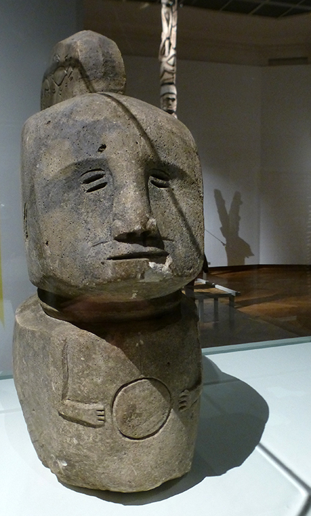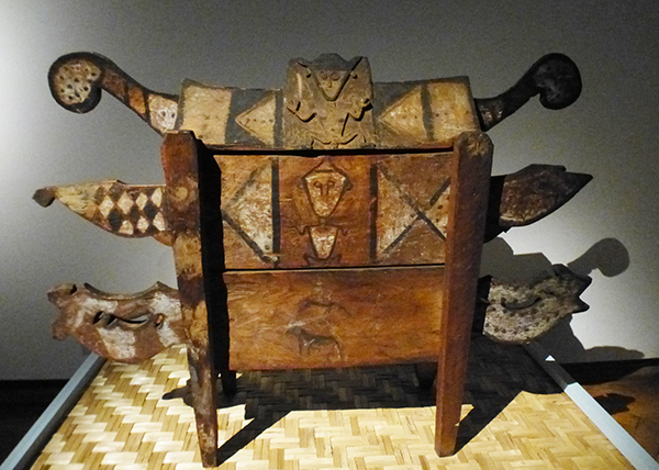 Tous les matériaux sont convoqués. La pierre omniprésente pour les grandes tombes sumbanaises, mais aussi les singa batak ou les osa osa de l’île de Nias, se retrouve pour cette étrange figure du Timor dont la coiffe est ornée de motifs de crocodile, de scorpions et de coq…