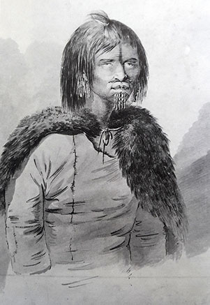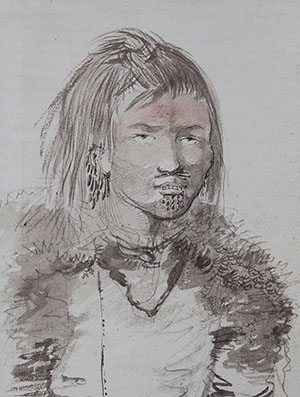Photo 1 : Homme de Nootka Sound, dessin de la collection Farquhar, réalisé par John Webber probablement le 22 avril 1778.