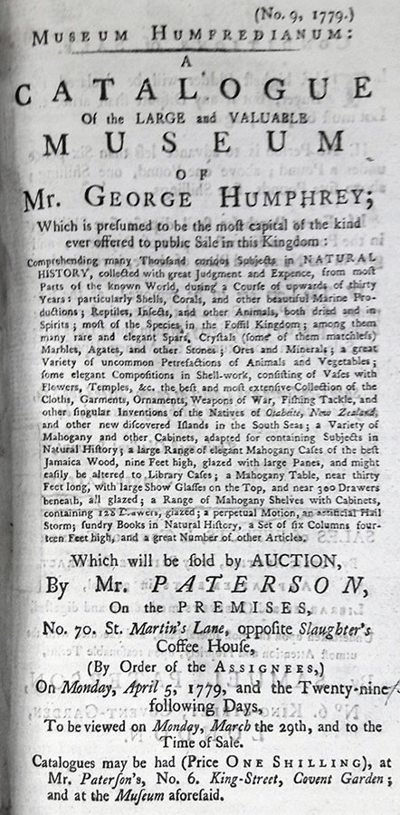 Deux autre moments importants dans ses acquisitions ont été les ventes de George Humphrey, ce marchand qui fournit notamment Göttingen lors de la donation royale de 1782 . Humphrey était connu pour avoir acheté tout ce qu’il pouvait au retour de la deuxième expédition en 1775, en se rendant directement auprès des navires à leur arrivée au port. Malheureusement, très endetté il dût vendre une grande partie de sa collection en 1779 (ci-dessus la couverture du catalogue de la vente).